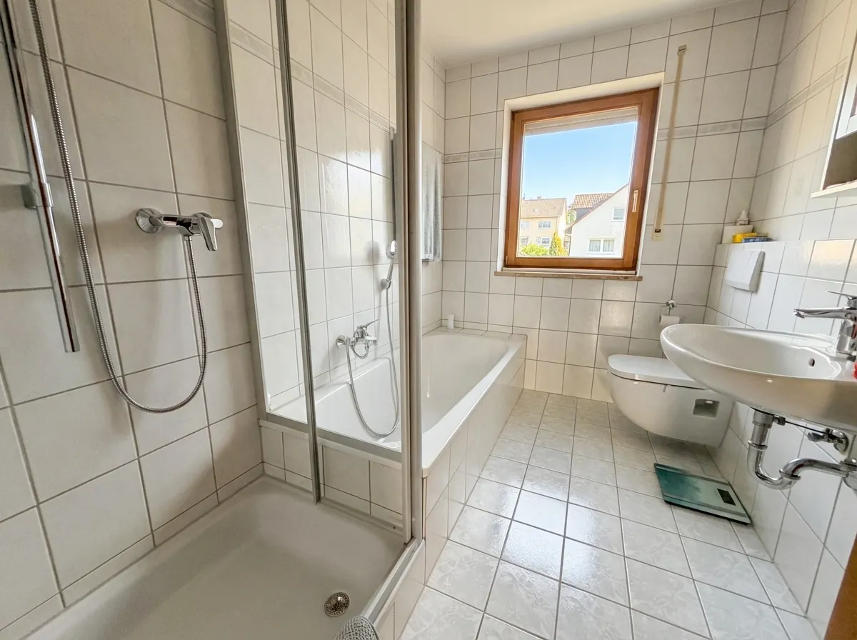| Bad mit Dusche, Wanne, Fenster |