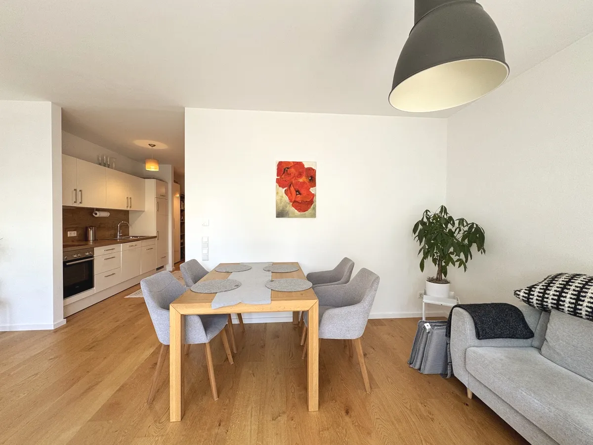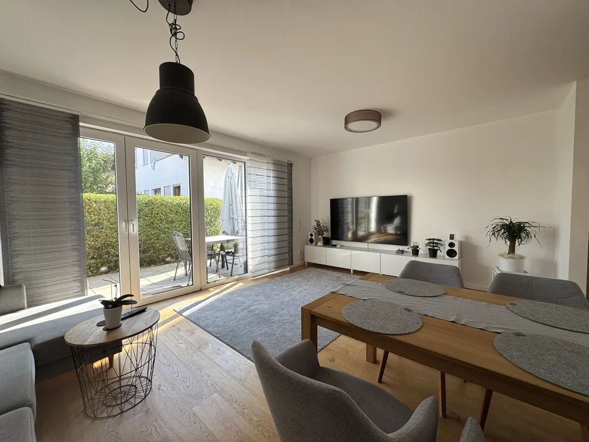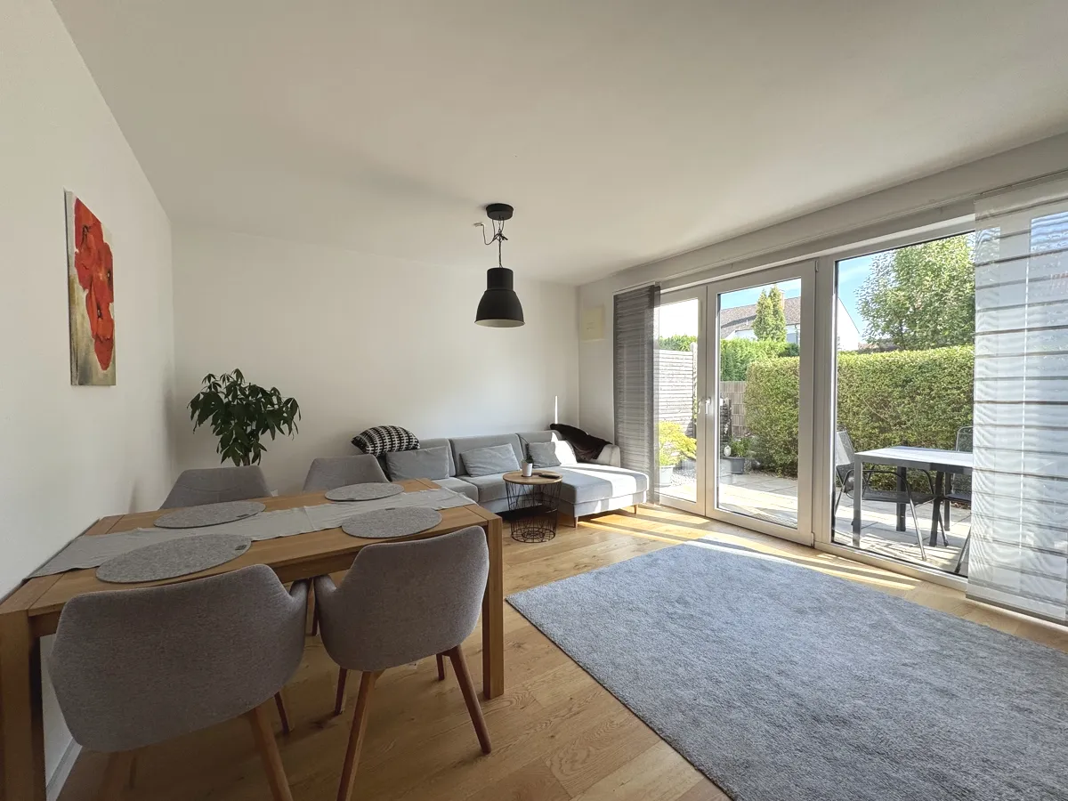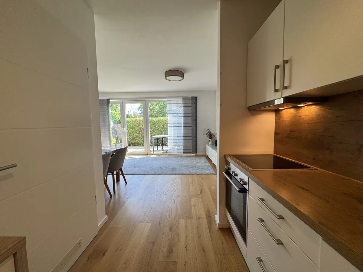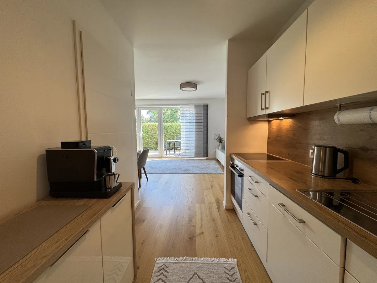 Der helle Wohn- und Essbereich mit hochwertiger Einbauküche schafft eine einladende Atmosphäre. Große, bodentiefe Fenster öffnen den Raum zur sonnigen Südterrasse, die pflegeleicht gestaltet ist und zum Verweilen im Freien einlädt.