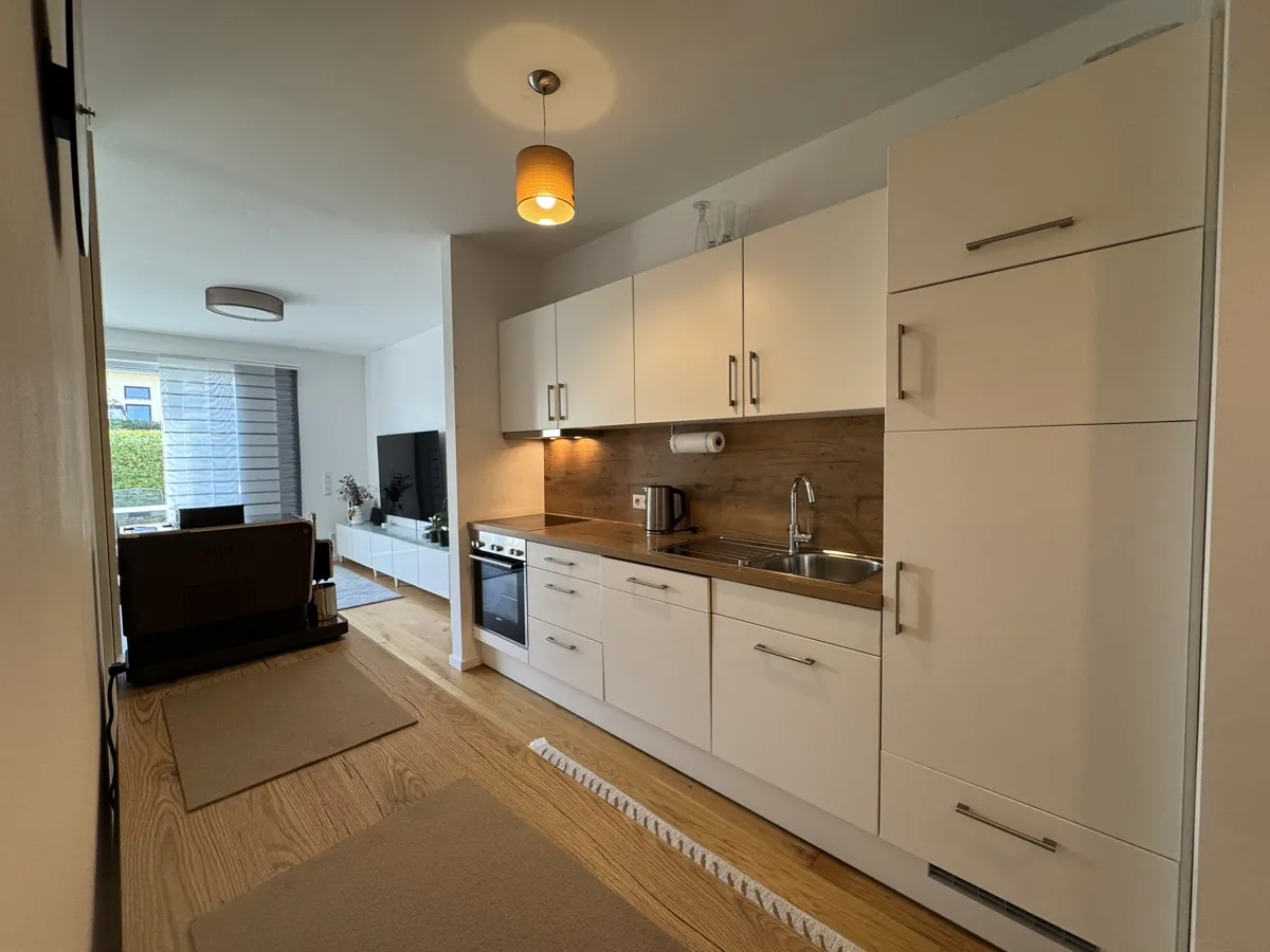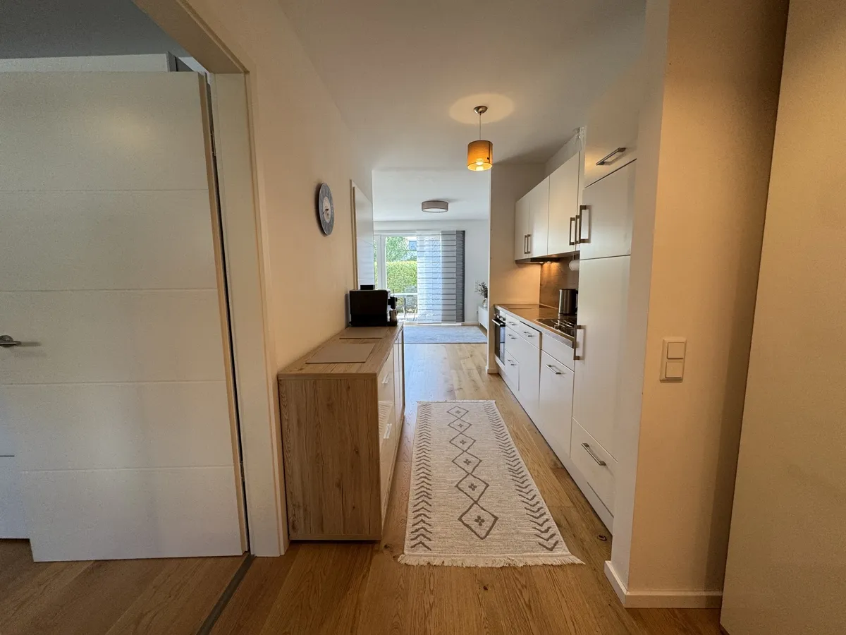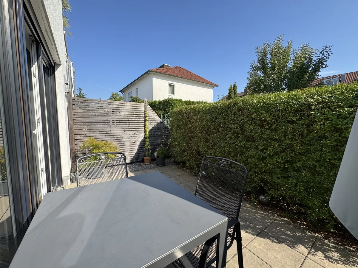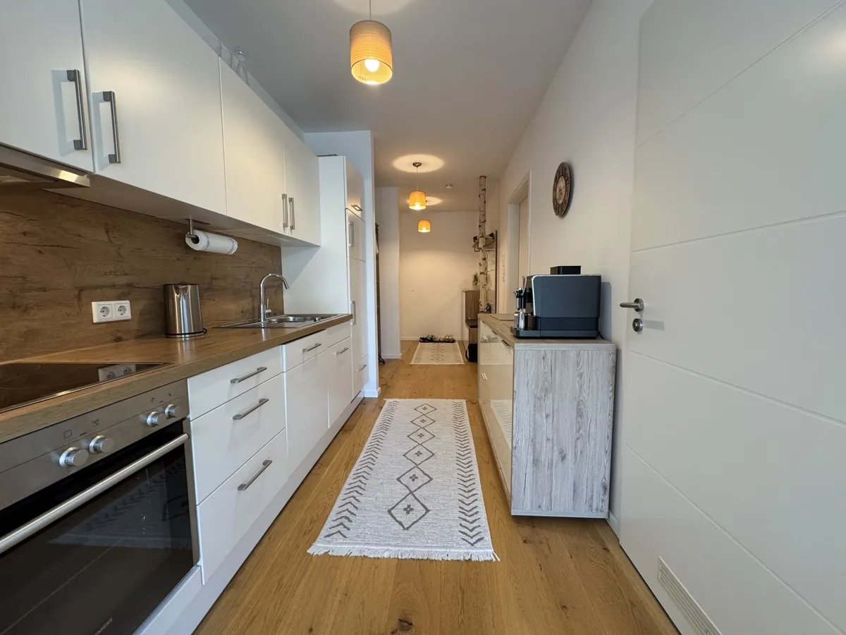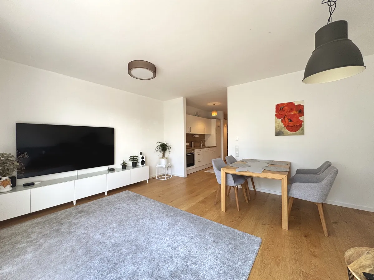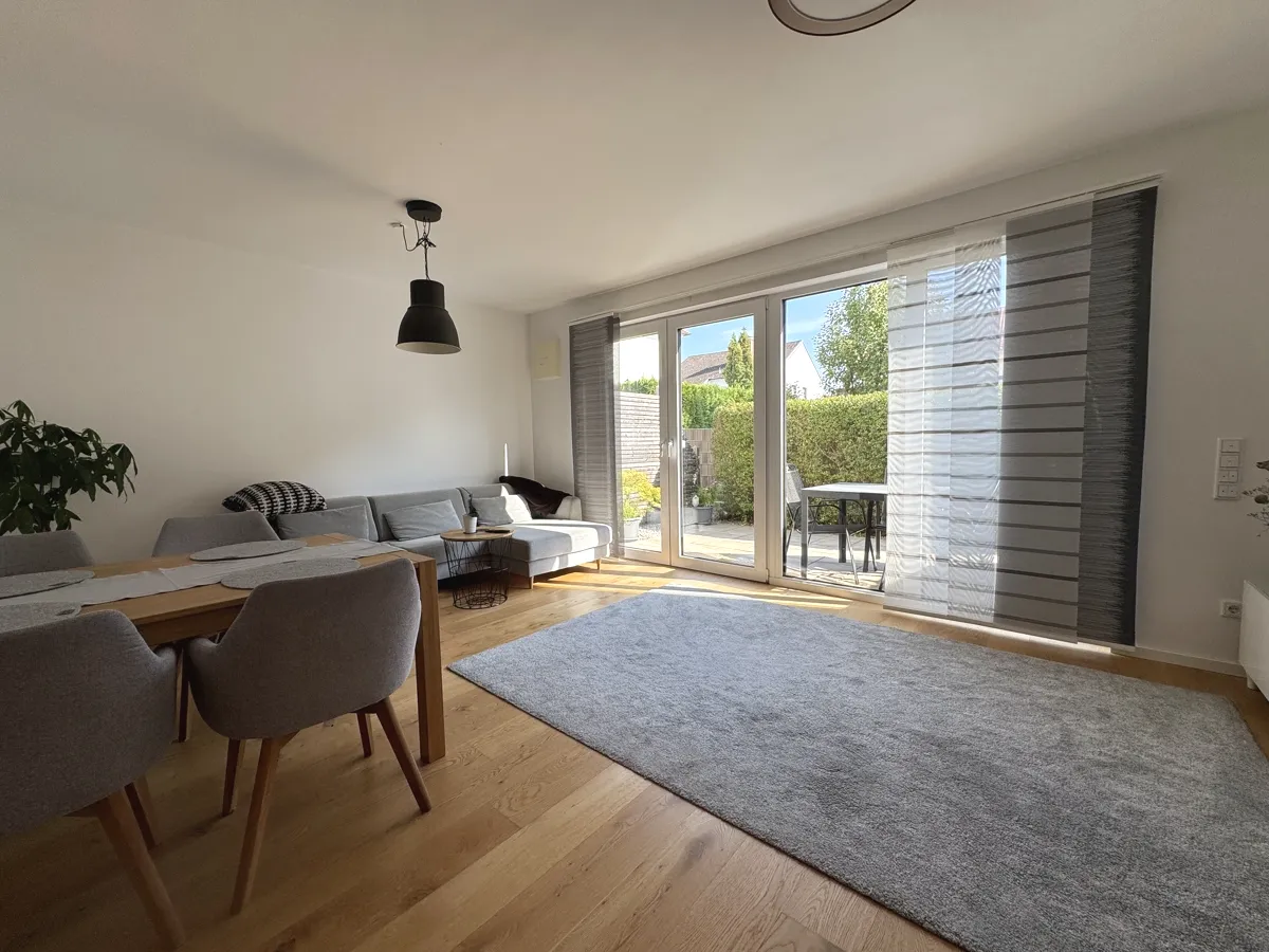 Der helle Wohn- und Essbereich mit hochwertiger Einbauküche schafft eine einladende Atmosphäre. Große, bodentiefe Fenster öffnen den Raum zur sonnigen Südterrasse, die pflegeleicht gestaltet ist und zum Verweilen im Freien einlädt.