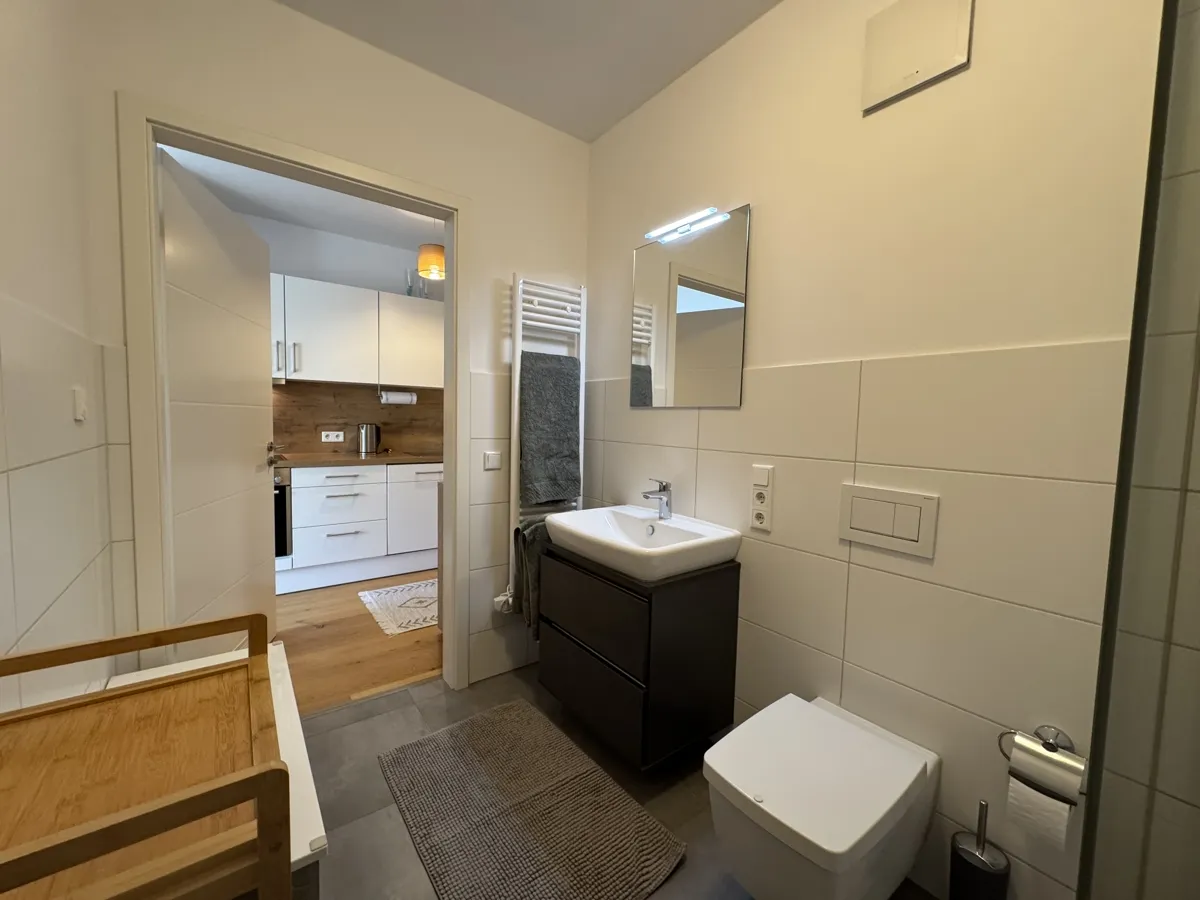 Das Badezimmer ist großzügig geschnitten und mit einer bodengleichen, begehbaren Dusche ausgestattet – funktional und elegant zugleich.