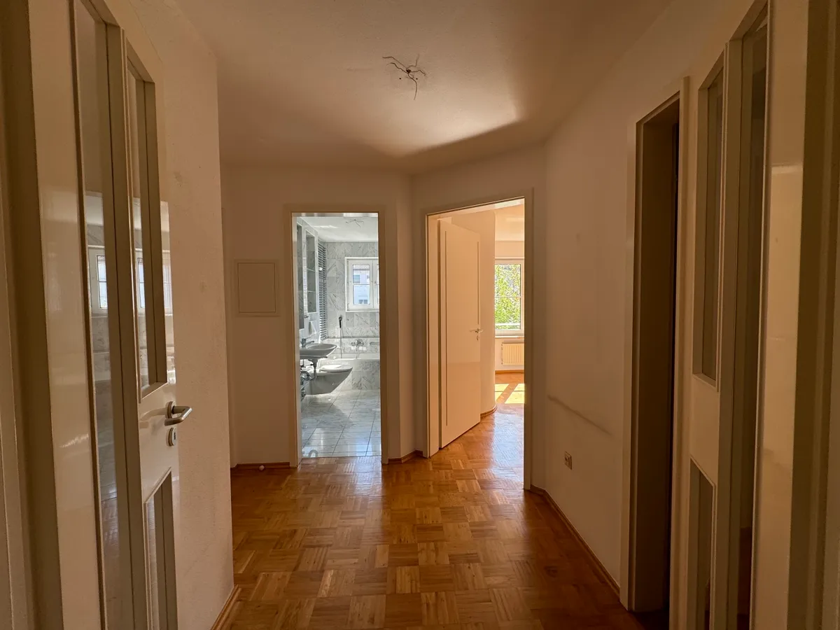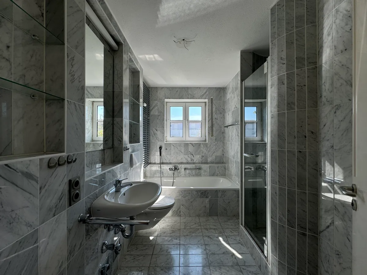 Die Wohnung ist edel ausgestattet. Weiß lackierte Designertüren, beheizbarer Handtuchhalter, elegantes Tageslicht - Marmorbad mit rund gemauerter Dusche und Badewanne. Alle Zimmer haben Parkettfußboden die restlichen Räume Marmor. Das Schlafzimmer ist hell und freundlich, der Wohn-Essbereich mit Zugang auf den großen Balkon liegt in Südwest Ausrichtung. Hier können Sie die Sonne ab Mittag bis zum Abend genießen. Praktisch finden wir den separaten Abstellraum.