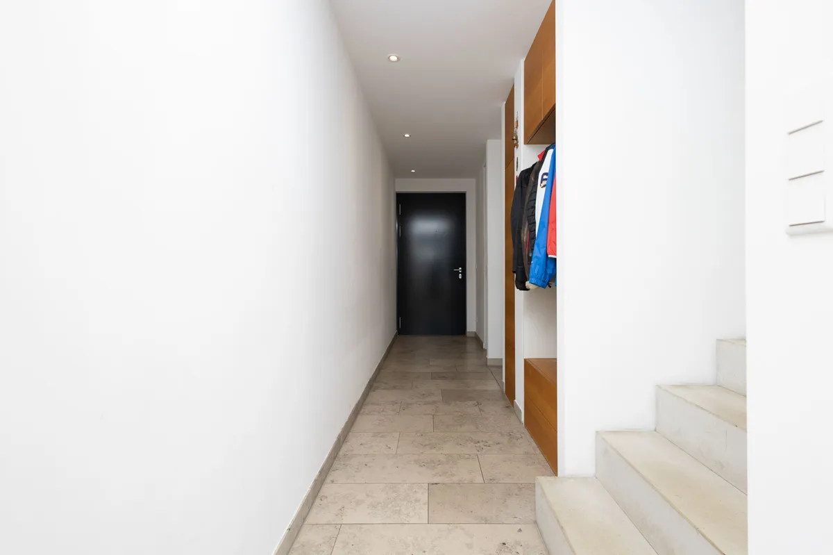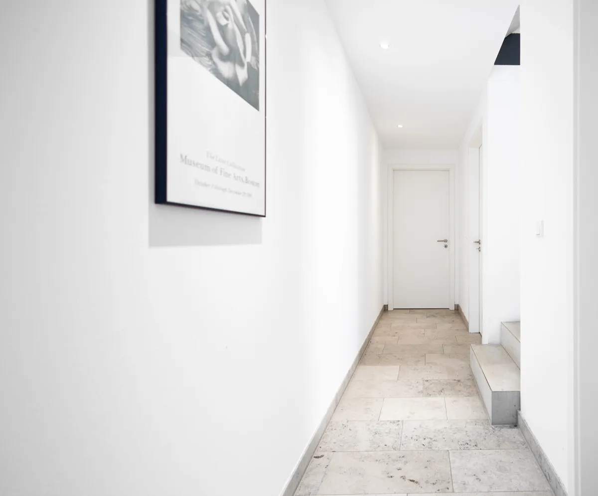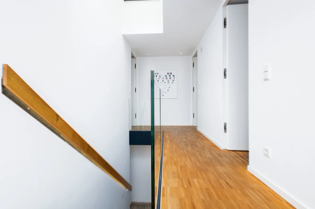Eine im Flur des Hauses einbezogene moderne Treppe aus Sichtbeton leitet ins Obergeschoss. Die abgrenzenden Glaselemente sind einer von vielen architektonischen Merkmalen im Gebäude.